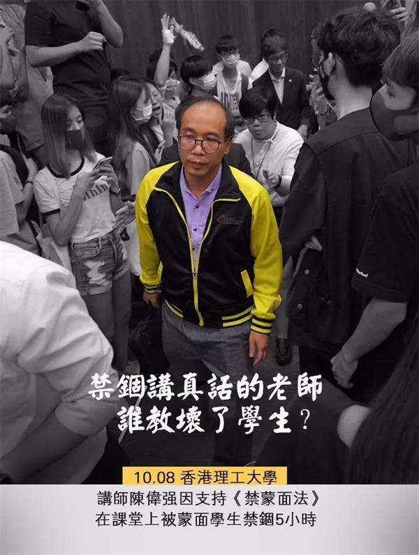 暴徒肆虐香港的大学校园,竟然将魔爪伸向老师。据报道,曾在接受采访时发表反对示威言论的香港理工大学讲师陈伟强,日前被大批蒙面学生在课堂内围堵及批斗,以激光笔照射及粗口指骂,前后禁锢近5小时。