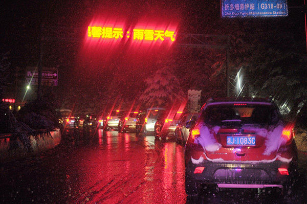 2018年10月2日晚,四川康定市突降大雪,国道318线折多山路段上山车辆排长队。 视觉中国 图