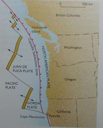 图1,卡斯卡迪亚俯冲带(齿状红线)和胡安·德·富卡板块 (图片来自网络)