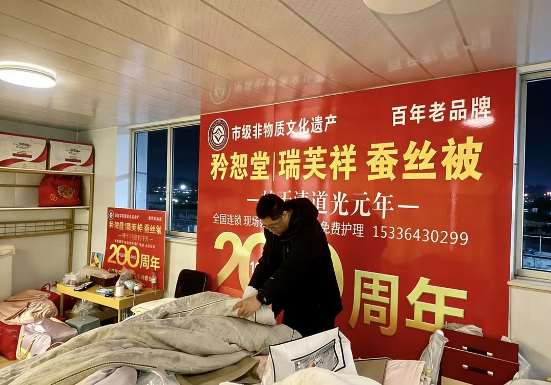 非遗是民族之魂,更是乡村振兴的文化底气。高青的蚕桑习俗,有着三千余年的悠久历史,早在姜太公封齐时期,就曾在此大力倡导植桑养蚕,让丝织业在这片土地上生根发芽。2018年,高青获评“中国蚕桑之乡”,传承千年的蚕丝被制作技艺,更是成为这片沃土上熠熠生辉的工艺瑰宝。2月10日晚,夜色渐深,市自来水公司驻高城镇孟荆陈村第一书记张效乾,仍在村非遗企业瑞芙祥农业科技公司的车间里忙碌。夜访过程中,他了解到该企业产品质量过硬,但销售情况一直不佳。得知这一难题后,张效乾迅速行动:通过中心城区“村村都有好项目”两场大型市集活动推广产品,联系多所中小学开展研学合作,进一步提升产品附加值;借助电商平台拓宽线上销售渠道,同时在派出单位的支持下,积极对接张店城区三家大型超市和农贸市场,建立起稳定的线下销售网络。此外,他还凭借自身专业优势,向国内知名篮球赛事公司推广产品,并与鲁西南淄博商会等合作单位保持良好合作关系,全力为企业破解销售困境。
