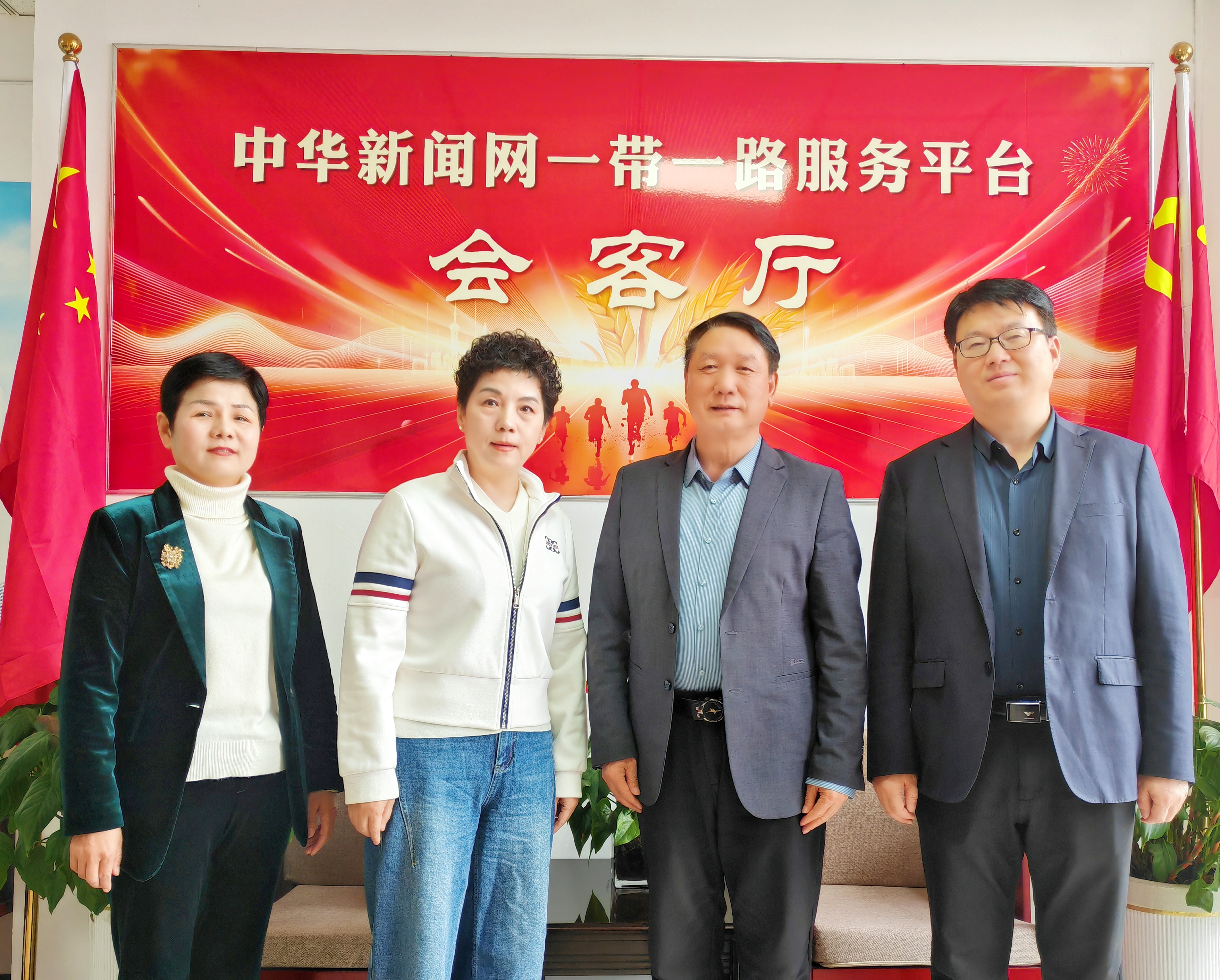 图片资料:小骆驼跨境电商集团董事长万震虎、总经理李萍、CEO权春霞首次造访中华新闻网一带一路服务平台时合影留念