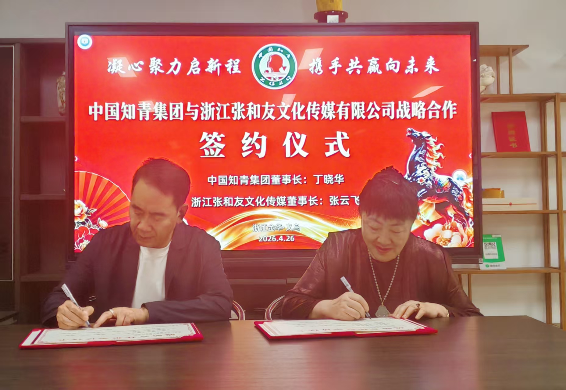 4 月 26 日下午,中国知青集团与浙江张和友文化传媒有限公司战略合作签约仪式在浙江金华义乌隆重举行。中国知青集团董事长丁晓华与浙江张和友文化传媒有限公司董事长张云飞代表双方签署战略合作协议;集团副总经理、退役军人事务部部长瞿建国,集团安徽运营中心总经理姚喜兰等领导出席并共同见证签约。 张云飞董事长是义乌跨境电商领域公认的实干派标杆与生态构建者—— 以全链路实战能力定义行业标准,以开放共享精神带动群体出海,是新时代义乌小商品走向全球市场的关键连接器与核心推动者。此次强强联手、战略结盟,双方将以共建 “中国知青文化产业生态圈” 为核心目标,坚持做有情怀、有责任、有实效的产业经营者,在银发经济蓬勃发展、文化产业繁荣兴盛的时代浪潮中,共创标杆项目、共享发展红利,为国家乡村振兴战略与文化强国建设,贡献中国知青的智慧、力量与担当。