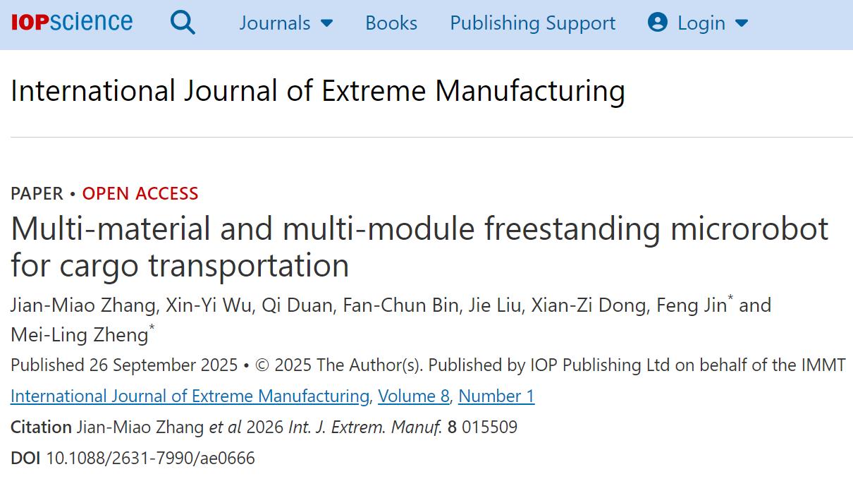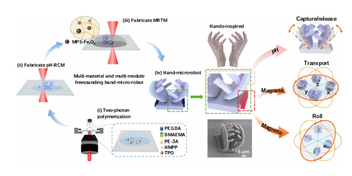 据悉,这项工作的技术核心是利用飞秒激光直写技术分模块加工了两种材料体系,制备了多功能集成的微纳机器人,在微观环境下实现复杂运动。