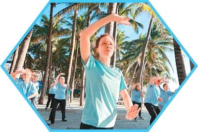 一月九日,在海南三亚大东海游览区,几名外国游客在椰林下学习打太极拳。袁永东摄(新华社发)