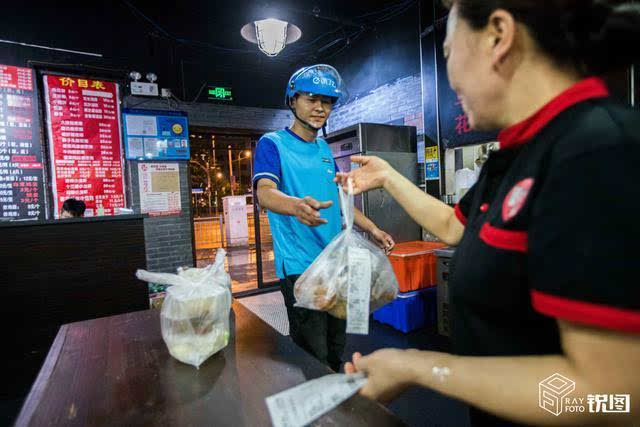 深夜十二点多,店内的接单机依旧不断提示着“您有新的外卖订单”,饿了么外卖小哥不断穿梭在店内取餐,带着温度的餐点由骑手送往附近的医院、金融公司加班的白领、各式豪宅里的消费者手中。(图片来源:锐图)