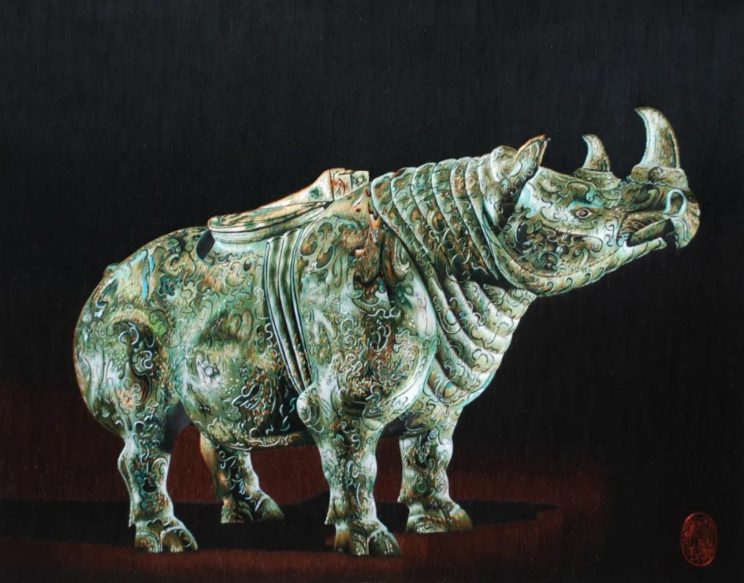 王丽华《 错金银云纹青铜犀尊》 刺绣 50X56 cm