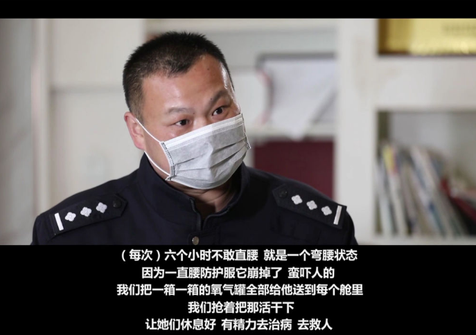 方舱医院民警张敬畏,每天穿着尺码偏小的防护服,蜷缩着身体连续六小时搬运氧气罐,他怕挺直腰板撑崩防护服,更怕护士姑娘们被重活累垮。