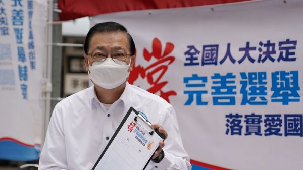 3月12日,在香港湾仔,港区全国人大代表谭耀宗在街站签名,支持完善香港选举制度。(王申 摄)