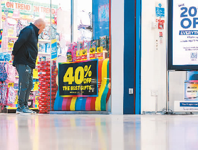 图为一名男子站在英国贝辛斯托克一家打折店铺门口。 |