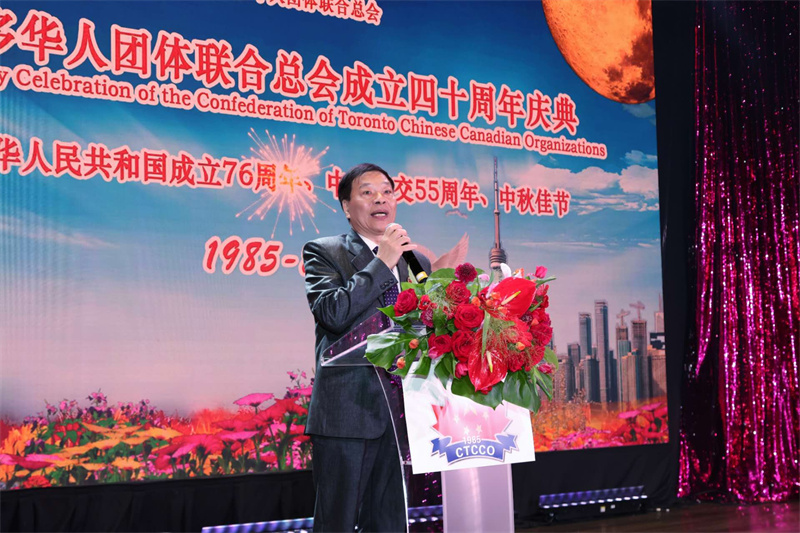 中国驻多伦多总领事馆代总领事程洪波在发言时首先向在场的嘉宾表示祝贺,他说:“我们欢聚在此,共同见证多伦多华联总会成立40周年,庆祝中华人民共和国成立76周年,纪念中加建交55周年,并共度中华民族的传统佳节——中秋节。在这四喜盈门的美好时刻,我谨代表中国驻多伦多总领馆,向华联总会致以热烈祝贺,并向在座的各位侨胞和各界朋友,致以诚挚的节日问候!