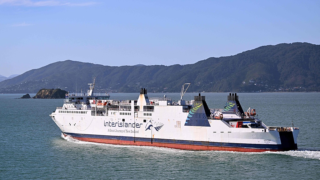 目前新西兰渡轮船队的平均船龄已高达28年。图为4月24日,从新西兰南岛皮克顿港出发前往北岛惠灵顿港的渡轮。(视觉中国)