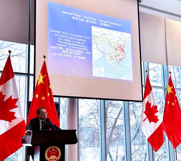 协会副会长Dr. Shum-Tim 代表协会介绍了协会的背景,宗旨,架构,及发展。并总结了成立15年来在加中医学交流方面所做出的工作。在协会组织的每年两次的赴华医学交流中,以多伦多大学,麦吉尔大学,麦可马斯特大学附属医院为主的医学专家们,在中国无偿的为1700位病人进行了会诊;为752位病人进行了手术;开展医学讲座920场;并接收了168名中高级医生来加拿大进修学习。这些工作大大促进了两国之间的医学交流与互动;增强了两国民间文化的认可与理解;传承了两国历史悠久的相互帮助与友谊。