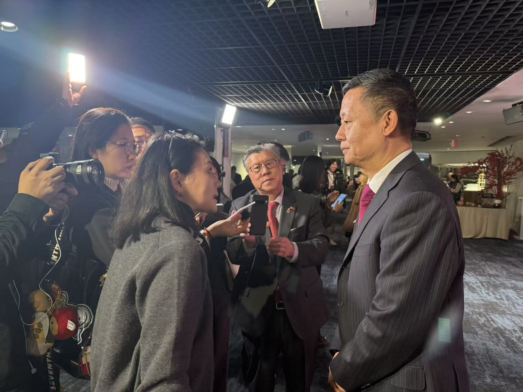 罗伟东总领事接受媒体采访。右二:中华新闻社副社长孙瑞祥教授(Lena Xu 摄)