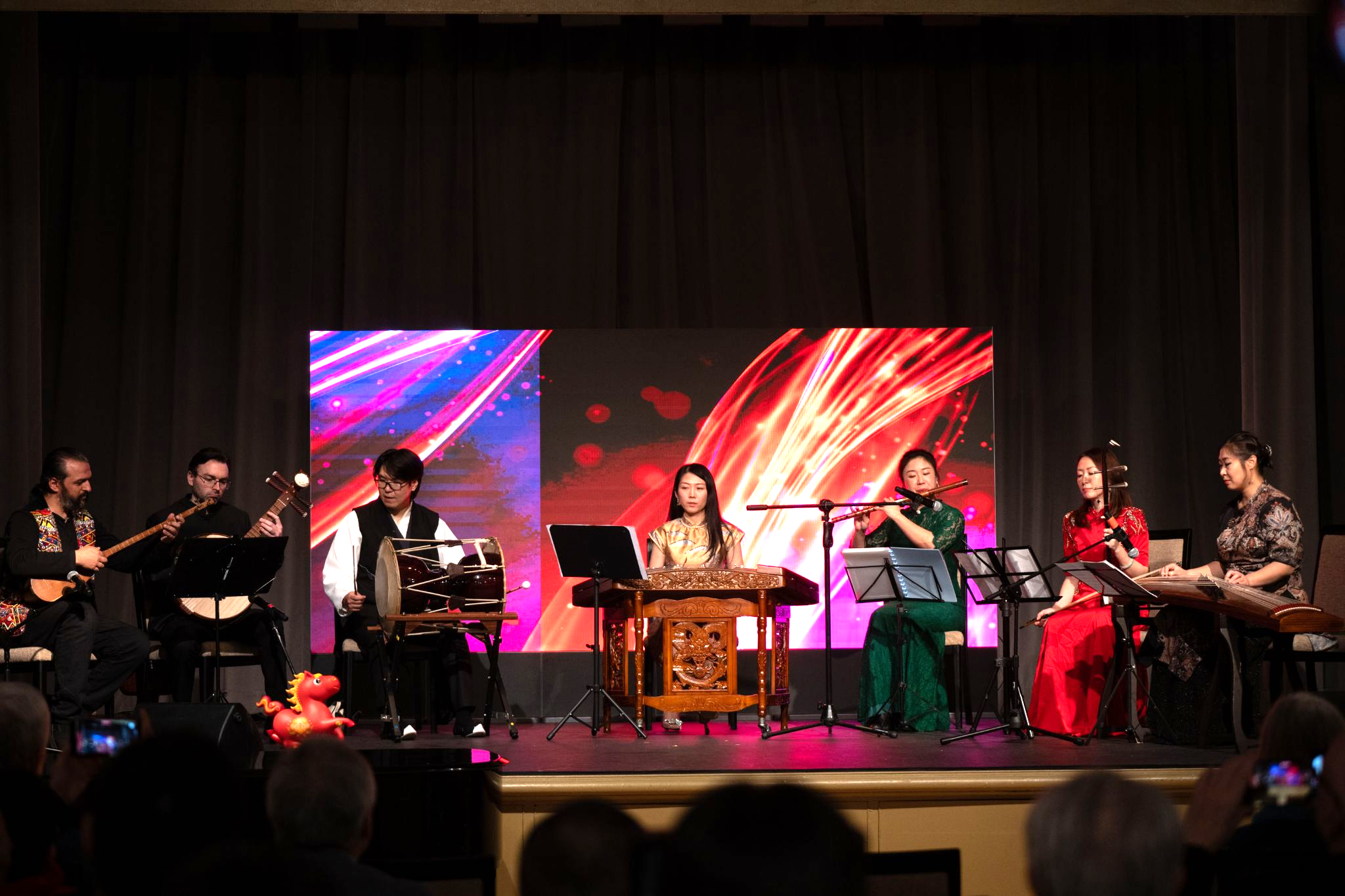 民乐专场首先由二胡演奏家白雪演绎经典曲目《良宵》代表“五行”中的“土”意象展开, ;继而进入“金”的清明之境——扬琴演奏家张迪的原创作品《凝光》,与大阮演奏家 Lorne 及伊朗鼓 Dayereh 演奏家 Mazdak 的伴奏下共同完成; 古筝演奏家秦子雯与箫演奏家王平的合奏《春江花月夜》体现了水的流动; 随后,韩国演奏家John Lee的大笒独奏《庆丰年》和王平演绎笛子曲《春到湘江》(伴奏:扬琴 张迪,大阮 Lorne)使“木”的生发之气逐渐展开; 当节奏逐渐积聚,“火”的能量在舞台上被点燃, Mazdak Tavassoli 的Tanbour独奏,与John Lee呈现的韩国传统鼓乐Suljanggu 相继登场,强烈而富有张力的节奏将不同文化的声音汇聚为同一脉动,营造出热烈而开放的节庆氛围。
