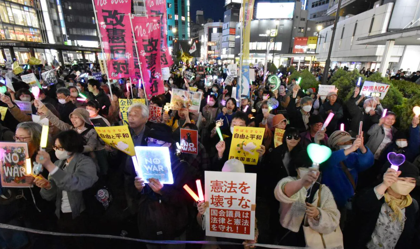 日本多名在野党高层与超6000民众5日晚在东京举行集会,抗议日本政府为武器出口“松绑”及推进大规模军事扩张等政策。图为抗议者手持“反对修改宪法”“不要战争”等标语。 (图源:日媒)