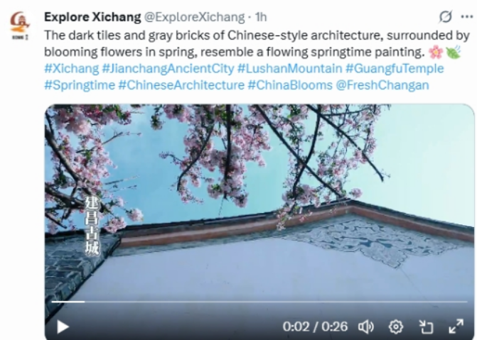 西昌国传发布:中式建筑的深色瓦片和灰色砖块,在春天被盛开的鲜花环绕,就像一幅流动的春日画卷。