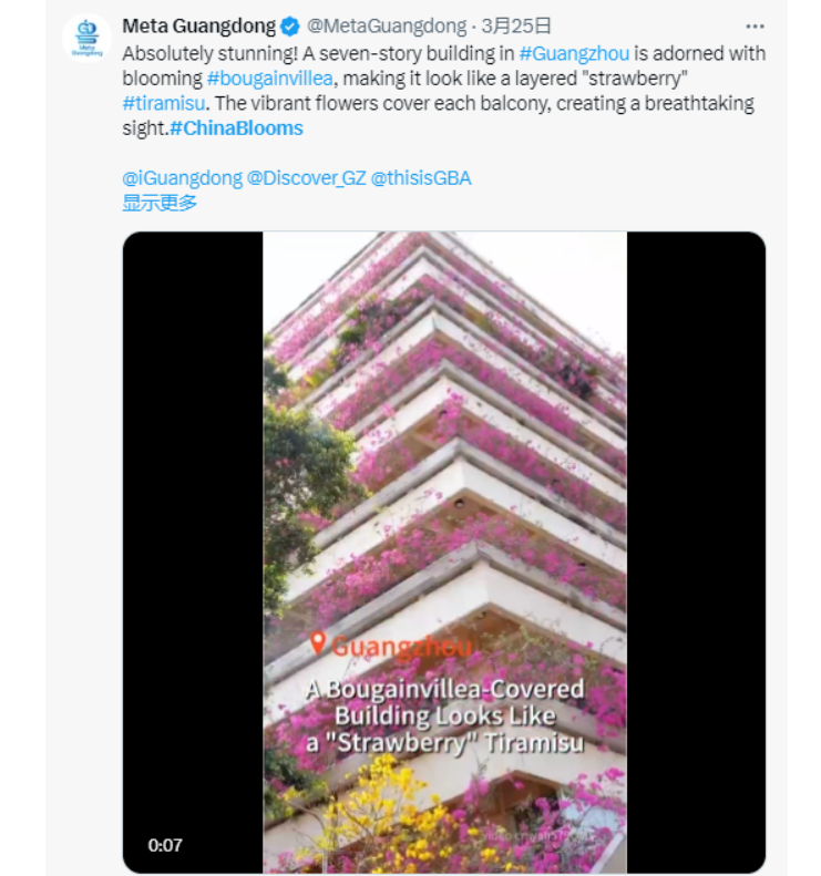 广东国传发布:真是惊艳!广州的一栋七层建筑被盛开的叶子花点缀得美轮美奂,宛如一颗层层叠叠的“草莓” 。鲜艳的花朵覆盖着每个阳台,构成一幅令人叹为观止的景象