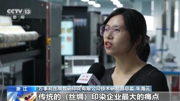 万事利丝绸数码印花有限公司技术研发部总监 朱海云:传统的丝绸印染企业最大的痛点就是库存压力,现在我们通过人工智能AI的设计,再加上我们的一体机快返的工艺特点,它能够达到一个先销后产的经营模式,能够解决我们库存压力的痛点。