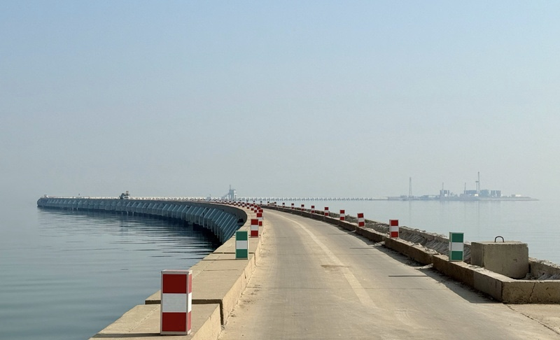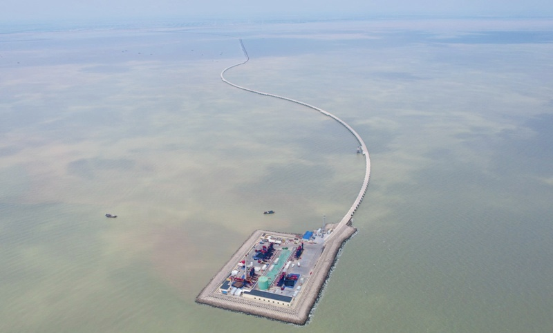 中国石化胜利油田青东5滩海陆岸采油平台的进海路呈“S”形( 李天睿 摄)